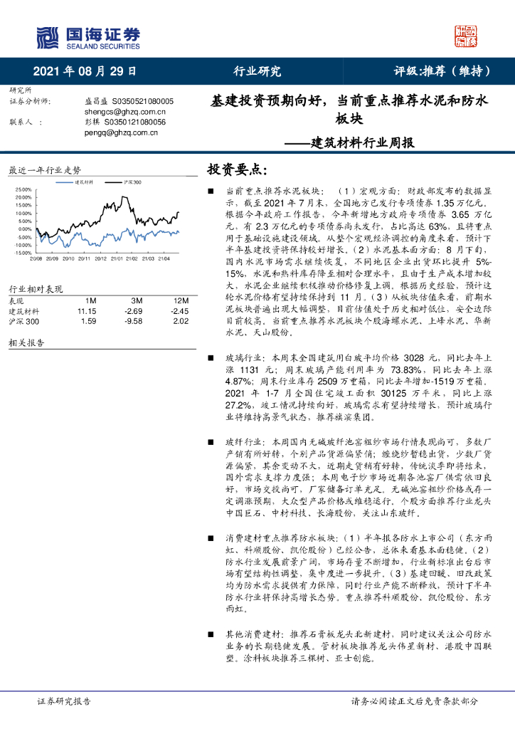 国海证券:建筑材料行业周报:基建投资预期向好,当前重点推荐水泥和防水板块.pdf