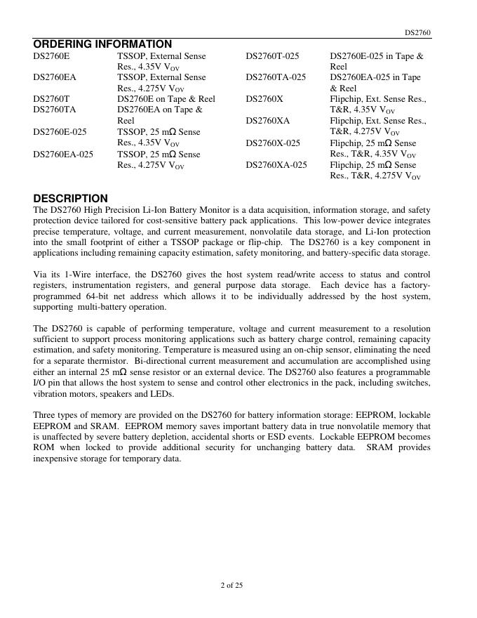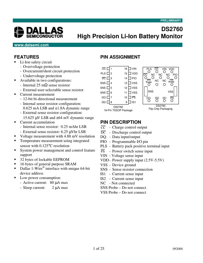 DALLAS DS2760 High Precision Li-Ion Battery Monitor 数据手册.pdf