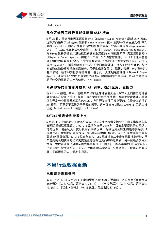国信证券:传媒互联网行业周报:豆包、昆仑天工等国产AI进展迅速,52TOYS递表港交所.pdf