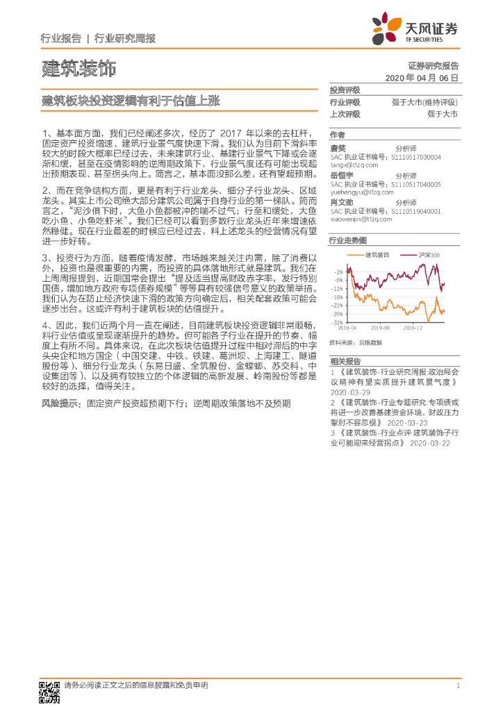 天风证券:建筑装饰行业研究周报:建筑板块投资逻辑有利于估值上涨.pdf