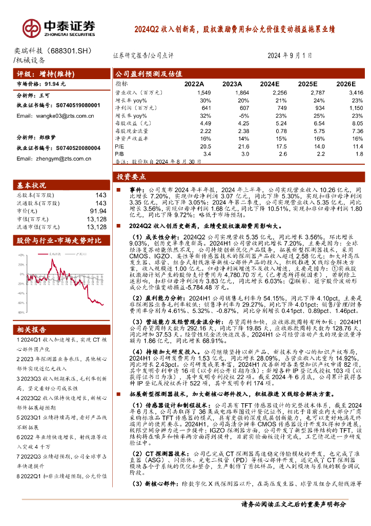 中泰证券:奕瑞科技(688301)-2024Q2收入创新高,股权激励费用和公允价值变动损益拖累业绩.pdf