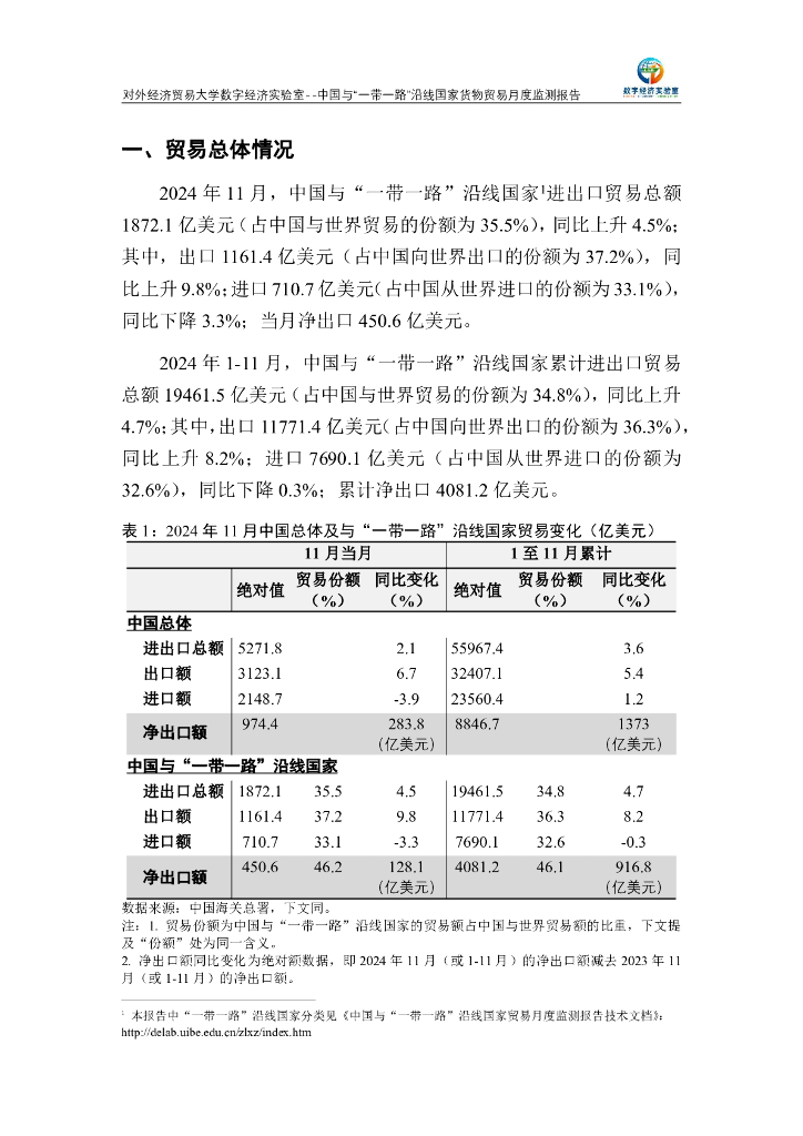 对外经济贸易大学:中国与“一带一路”沿线国家货物贸易月度监测报告(2024年1-11月).pdf