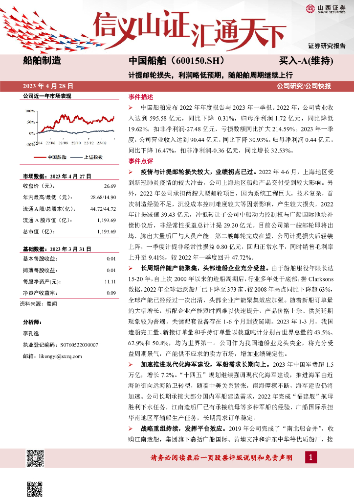 山西证券:中国船舶(600150)-计提邮轮损失,利润略低预期,随船舶周期继续上行.pdf