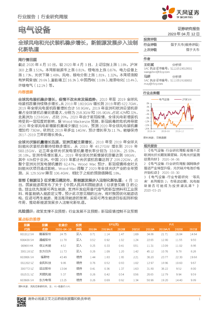天风证券:电气设备行业研究周报:全球风电和光伏装机稳步增长,新能源发展步入法制化新轨道.pdf