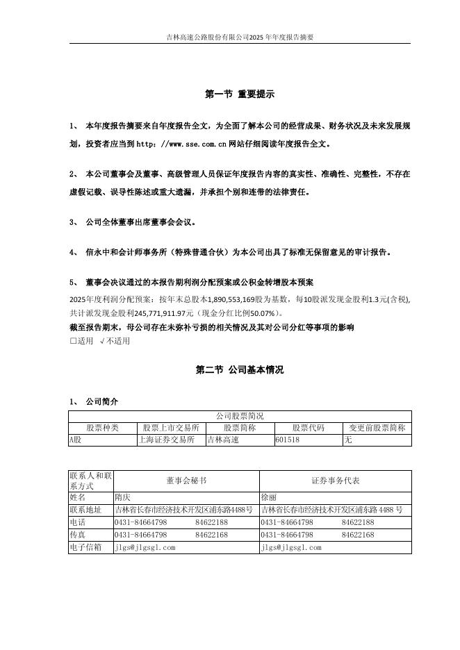 601518-吉林高速:吉林高速公路股份有限公司2025年年度报告—摘要.pdf