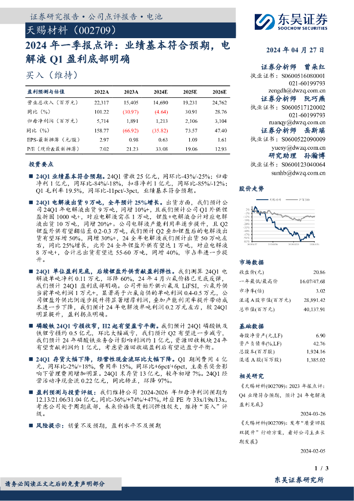 东吴证券:天赐材料(002709)-2024年一季报点评:业绩基本符合预期,电解液Q1盈利底部明确.pdf