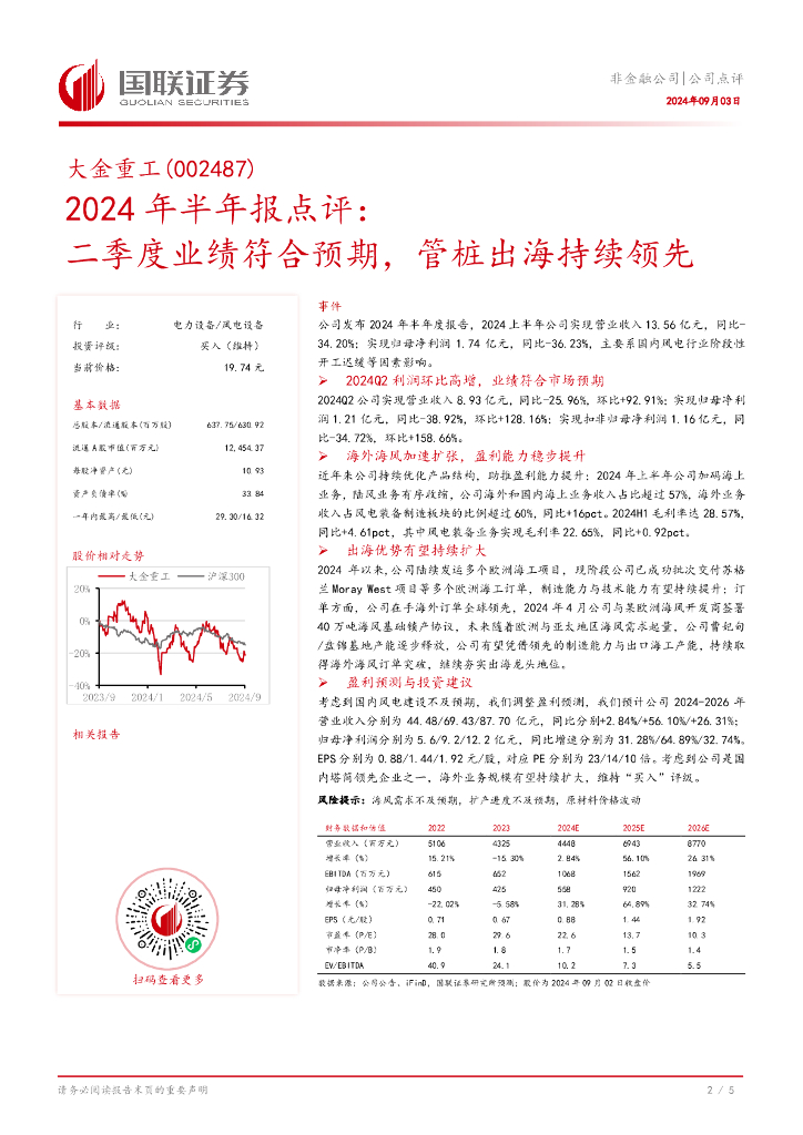 国联证券:大金重工(002487)-2024年半年报点评:二季度业绩符合预期,管桩出海持续领先.pdf