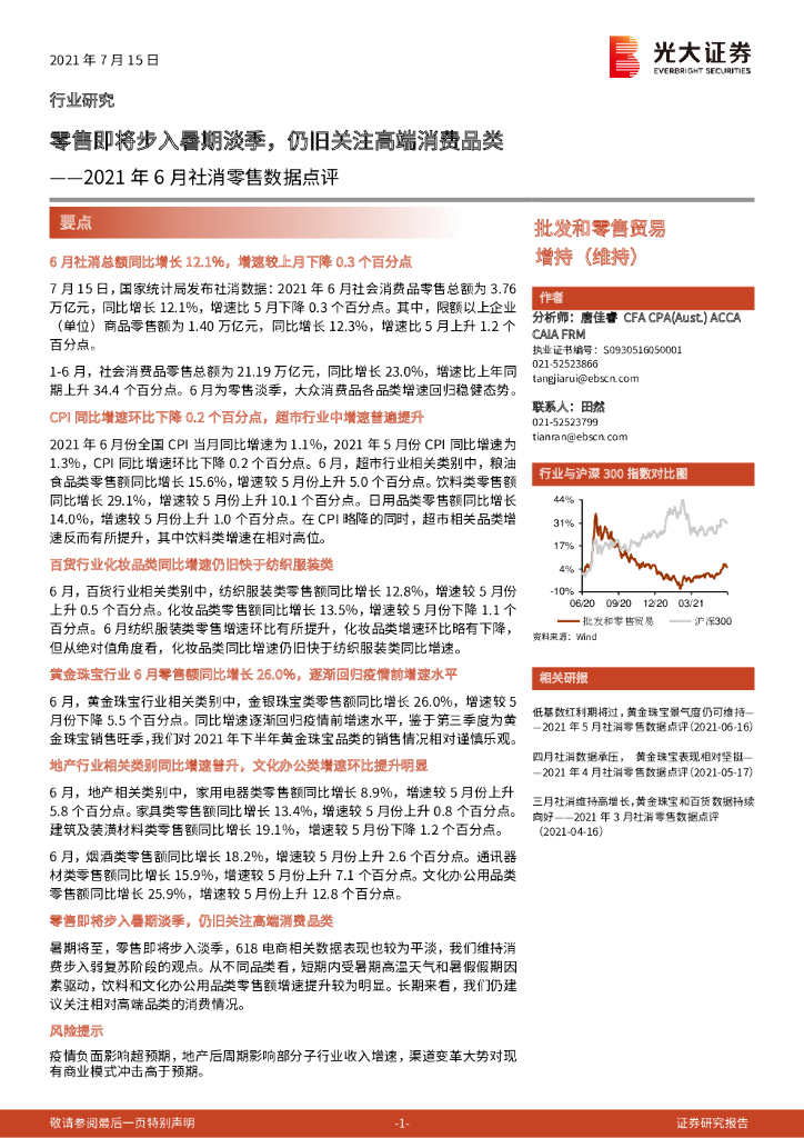 光大证券:2021年6月社消零售数据点评:零售即将步入暑期淡季,仍旧关注高端消费品类.pdf
