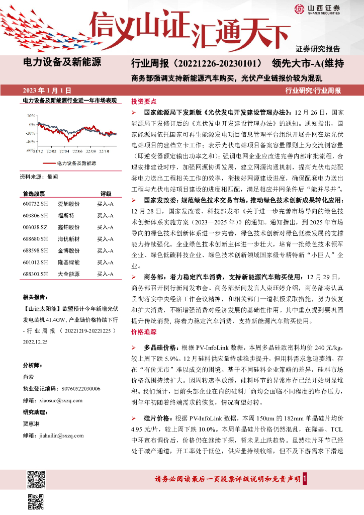 山西证券:电力设备及新能源行业周报:商务部强调支持新能源汽车购买,光伏产业链报价较为混乱.pdf