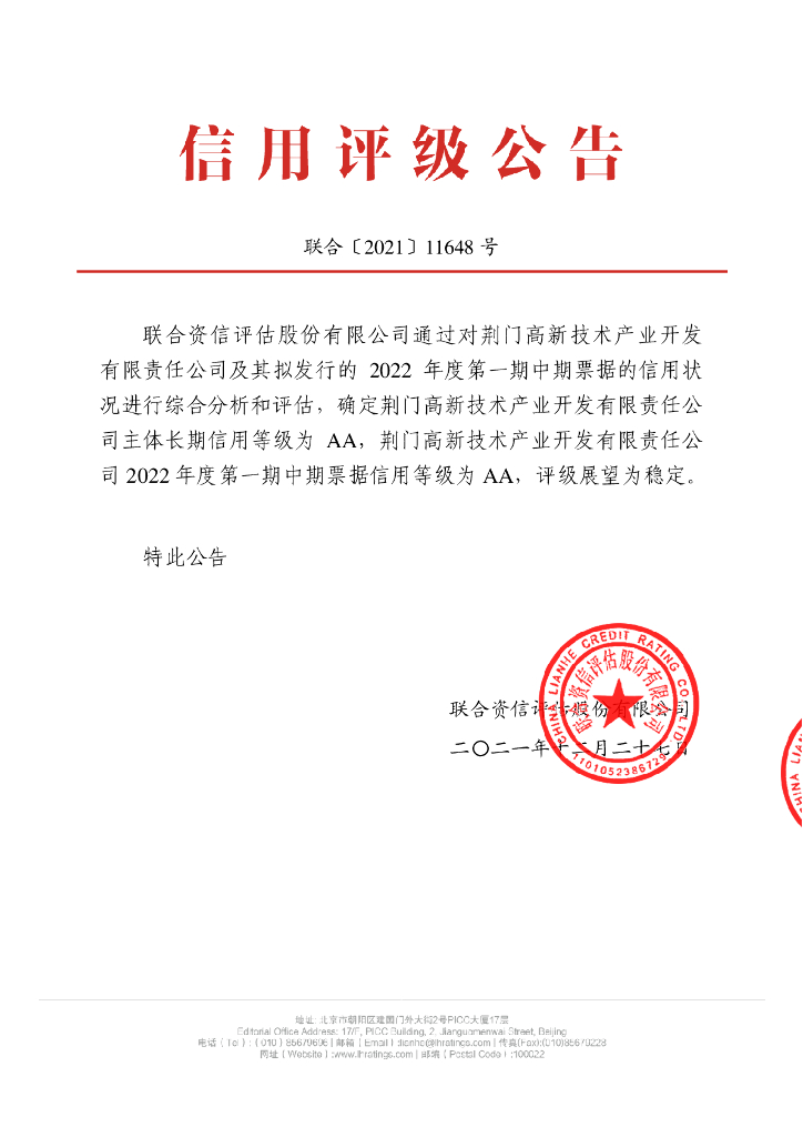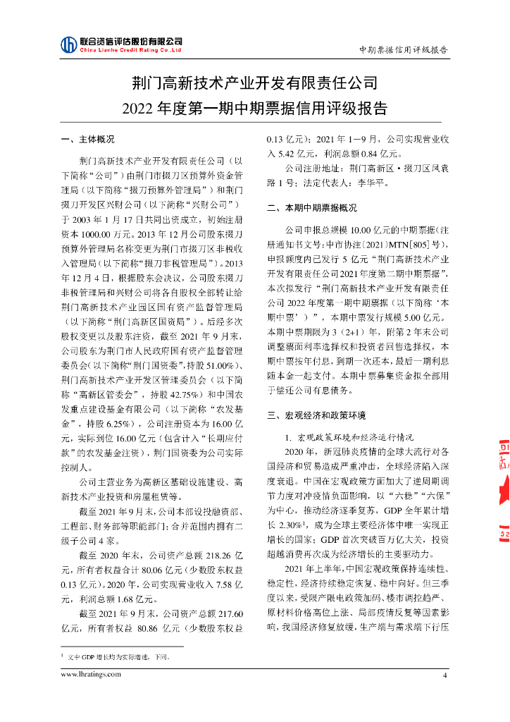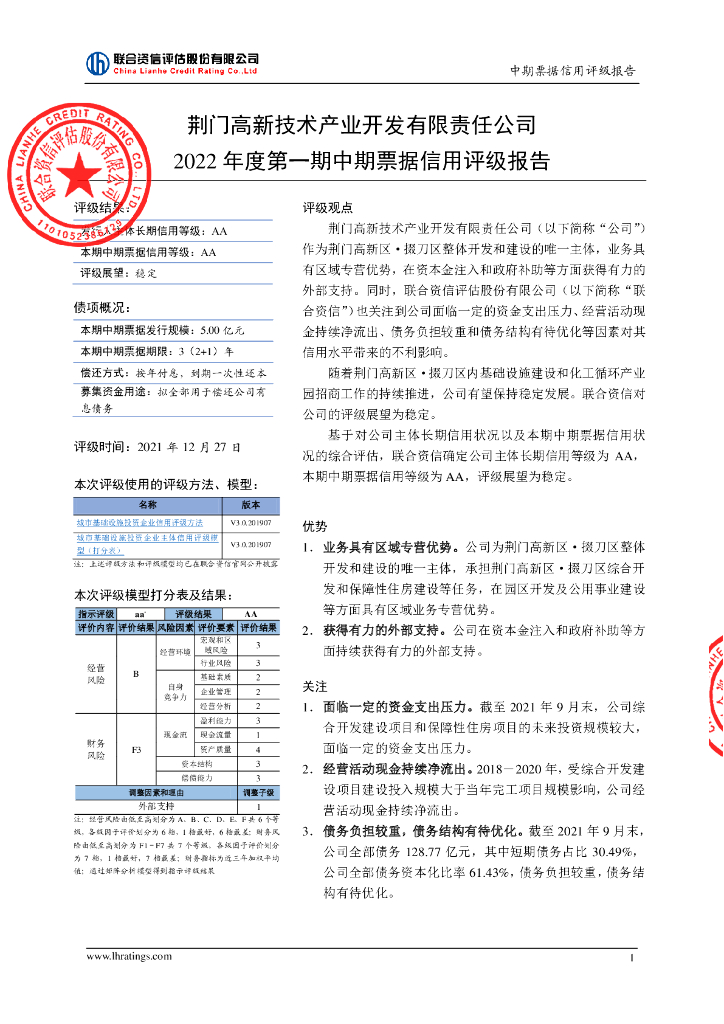 联合资信:荆门高新技术产业开发有限责任公司2022年度第一期中期票据信用评级报告.pdf
