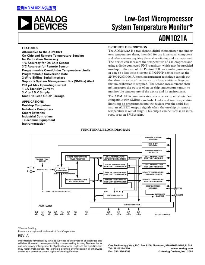 ANALOG DEVICES ADM1021A Low Cost Microprocessor System Temperature Monitor 数据手册.pdf