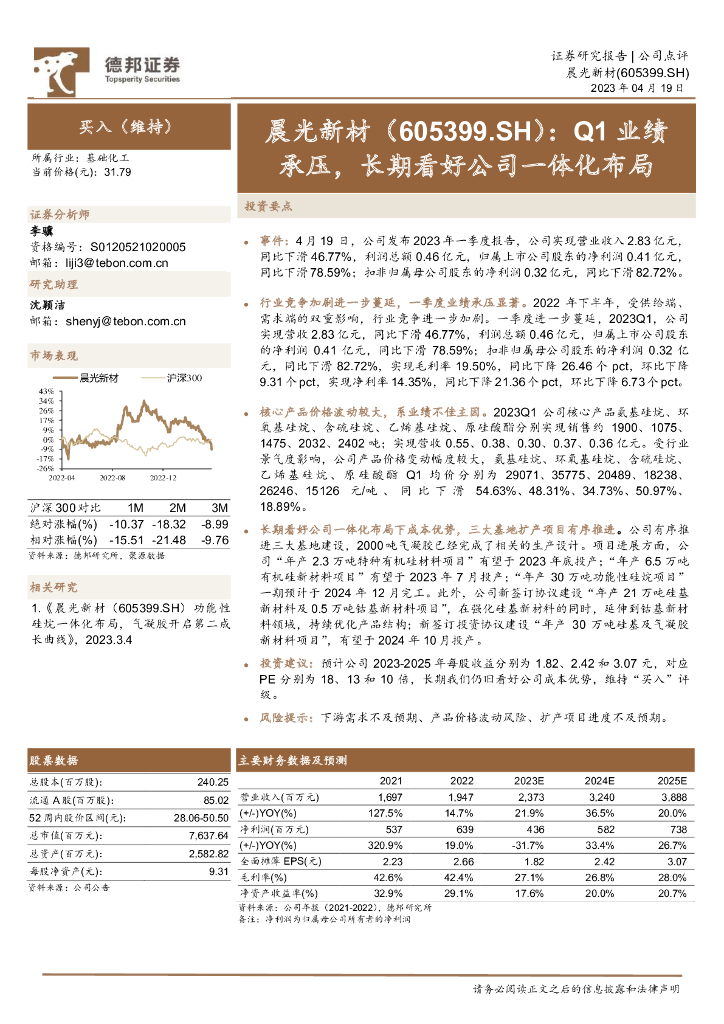德邦证券:晨光新材(605399)-Q1业绩承压,长期看好公司一体化布局.pdf