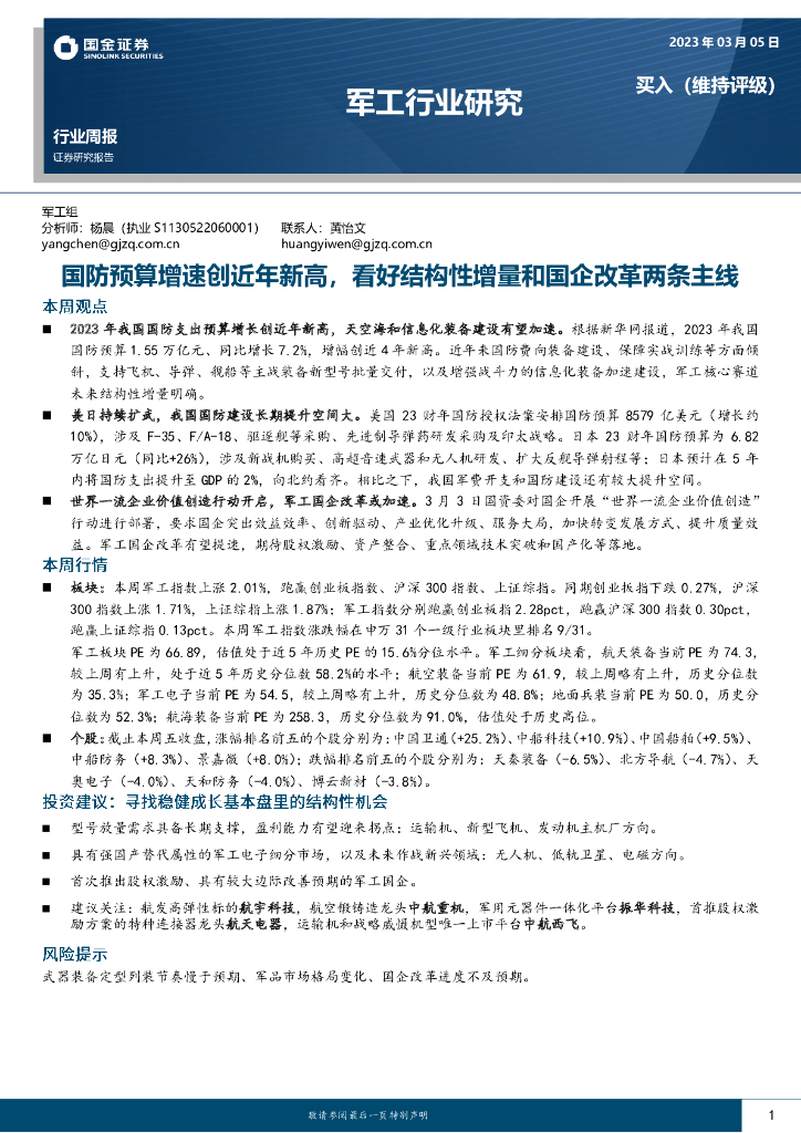 国金证券:军工行业研究:国防预算增速创近年新高,看好结构性增量和国企改革两条主线.pdf