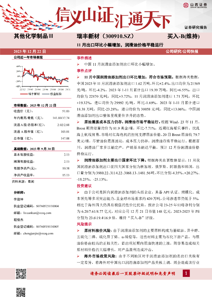 山西证券:瑞丰新材(300910)-11月出口环比小幅增加,润滑油价格平稳运行.pdf