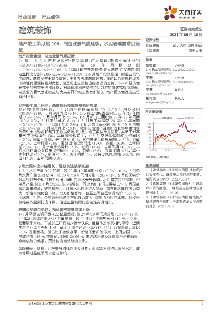 天风证券:建筑装饰行业点评:地产竣工单月超10%, 制造业景气度延续,水泥玻璃需求仍坚挺.pdf