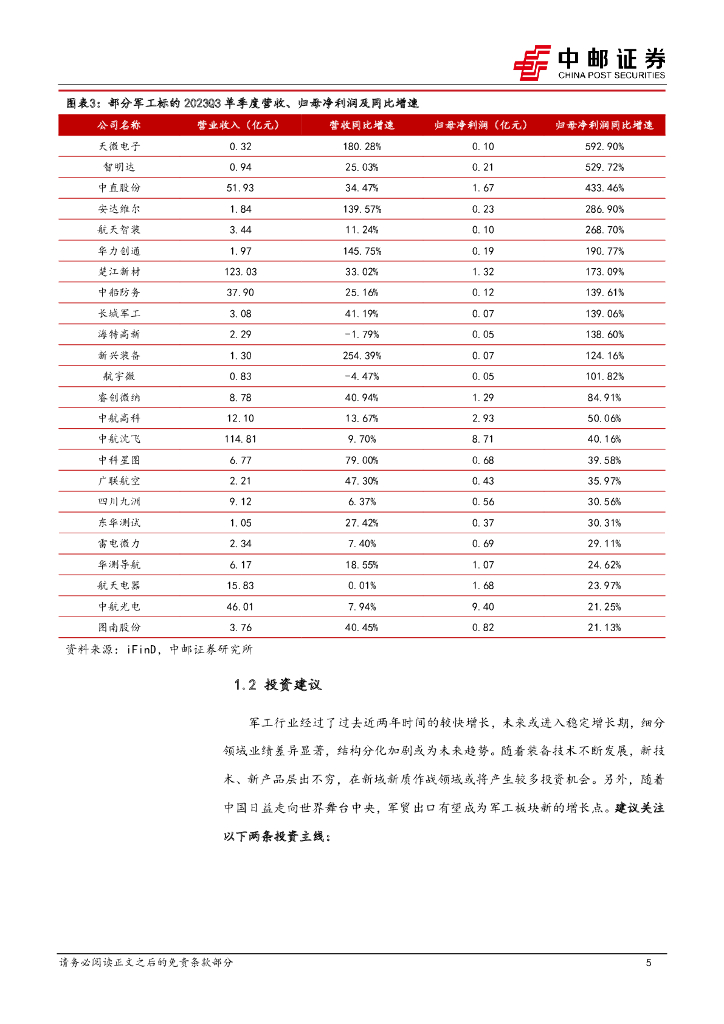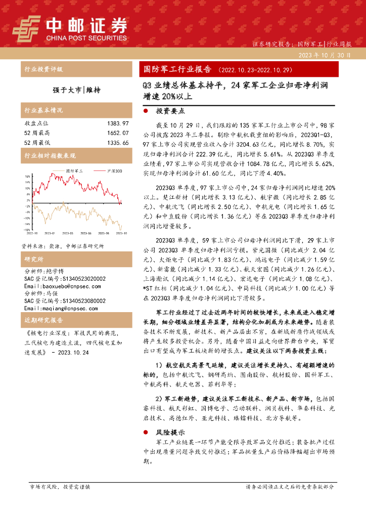 中邮证券:国防军工行业报告:Q3业绩总体基本持平,24家军工企业归母净利润增速20%以上.pdf