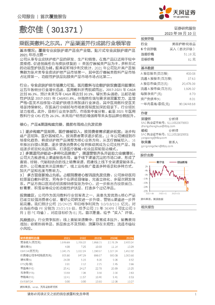 天风证券:敷尔佳(301371)-乘医美敷料之东风,产品渠道并行成就行业领军者.pdf