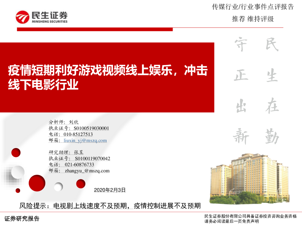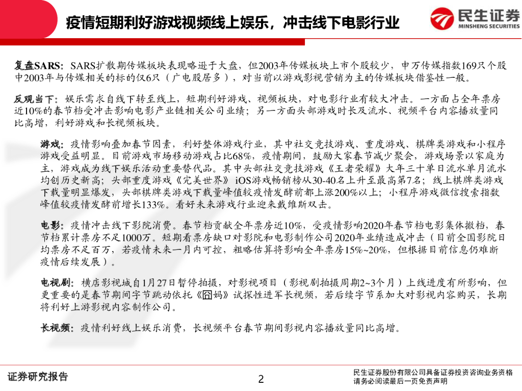 民生证券:传媒行业:疫情短期利好游戏视频线上娱乐,冲击线下电影行业.pdf