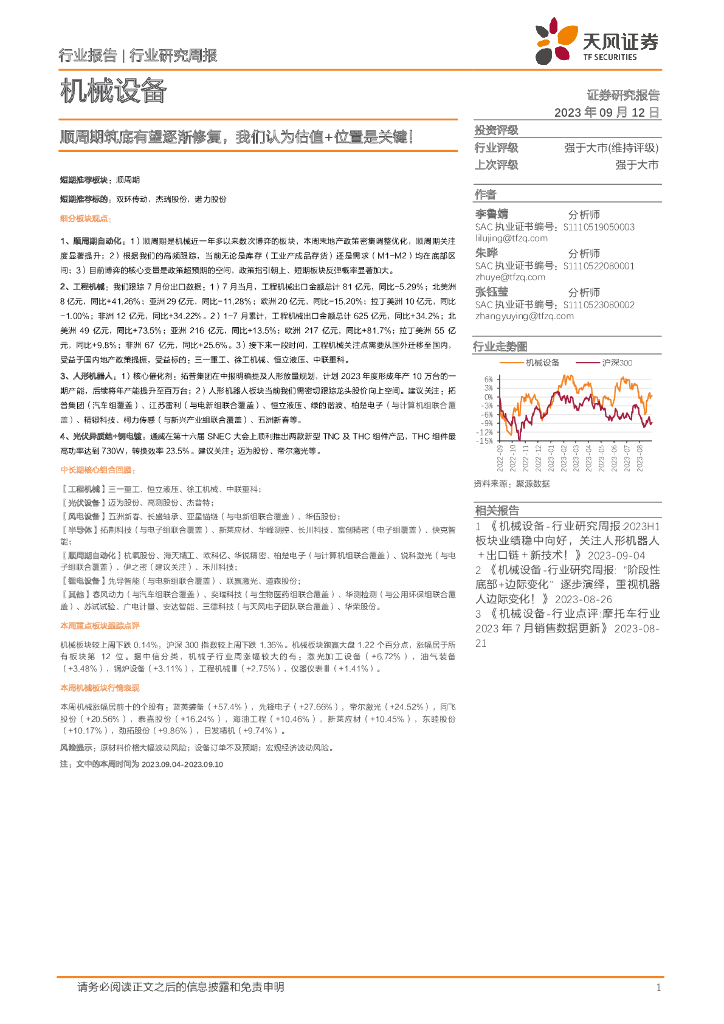 天风证券:机械设备行业周报:顺周期筑底有望逐渐修复,我们认为估值+位置是关键!.pdf