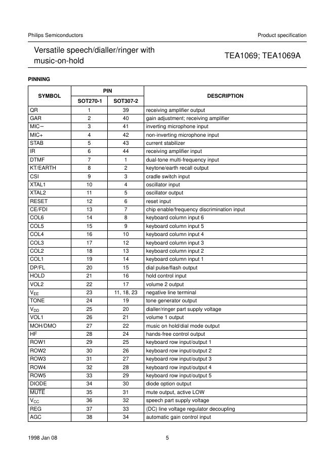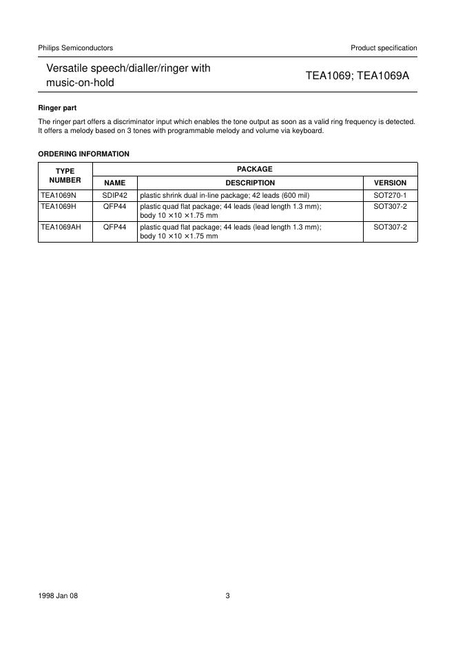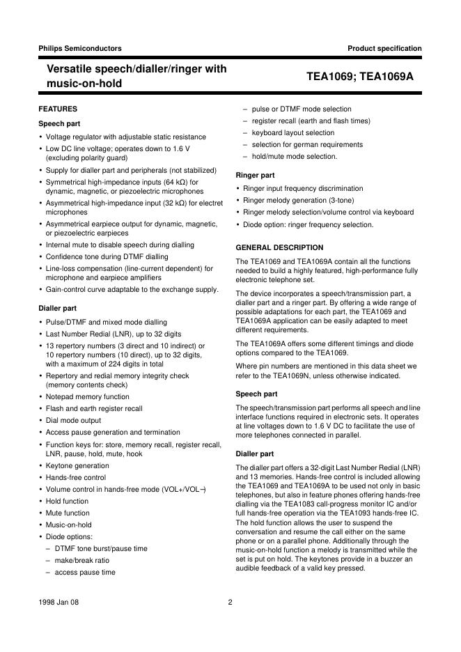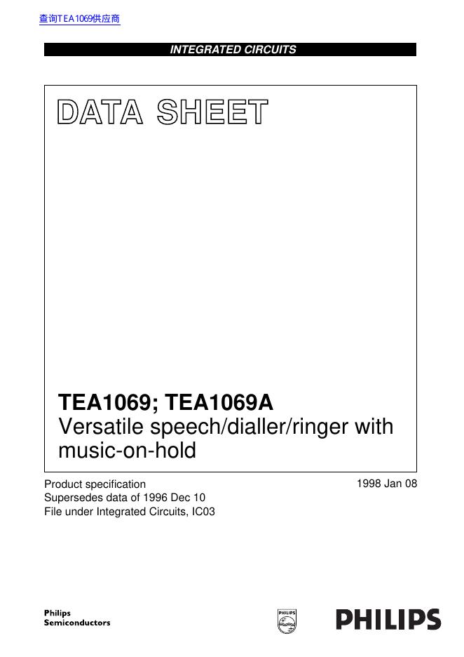 PHILIPS TEA1069; TEA1069A Versatile speech/dialler/ringer with music-on-hold 数据手册.pdf