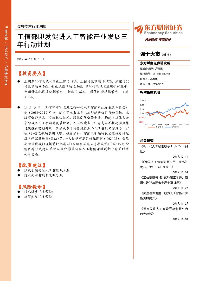 东方财富证券:信息技术行业周报:工信部印发促进人工智能产业发展三年行动计划.pdf