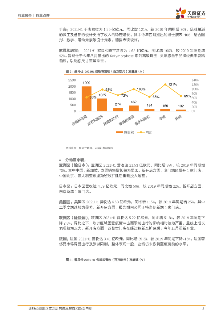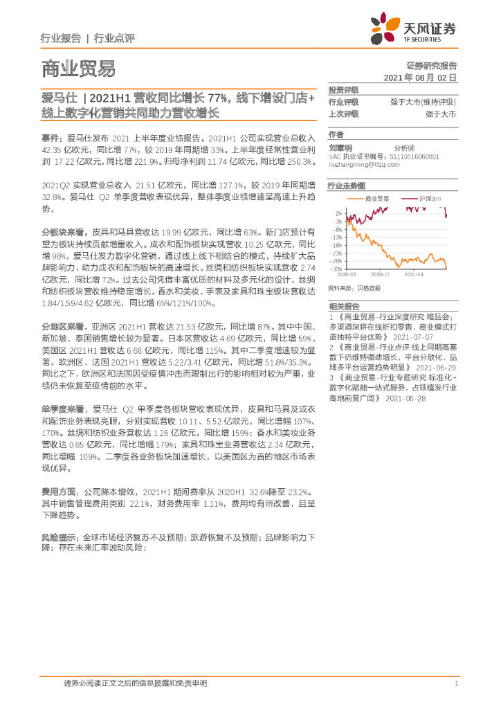 天风证券:商业贸易行业点评:爱马仕|2021H1营收同比增长77%,线下增设门店+线上数字化营销共同助力营收增长.pdf