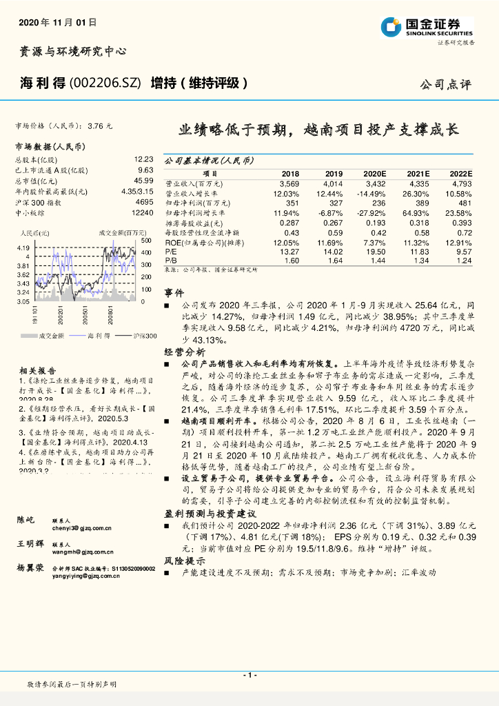 国金证券:海利得(002206)-业绩略低于预期,越南项目投产支撑成长.pdf
