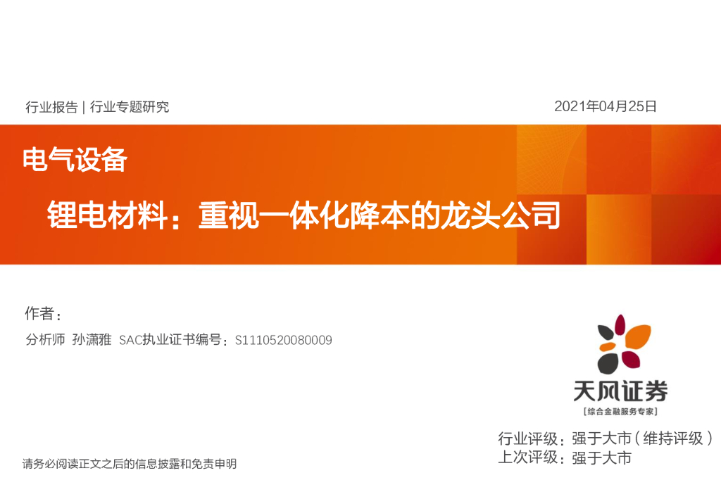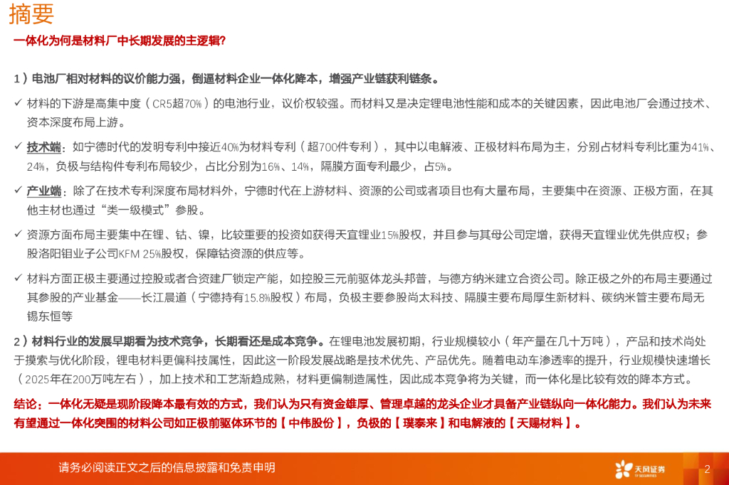 天风证券:电气设备行业专题研究:锂电材料:重视一体化降本的龙头公司.pdf