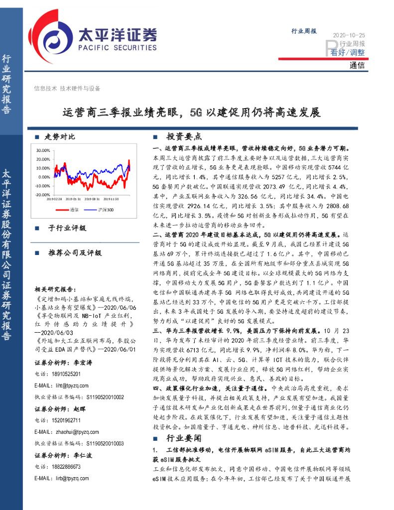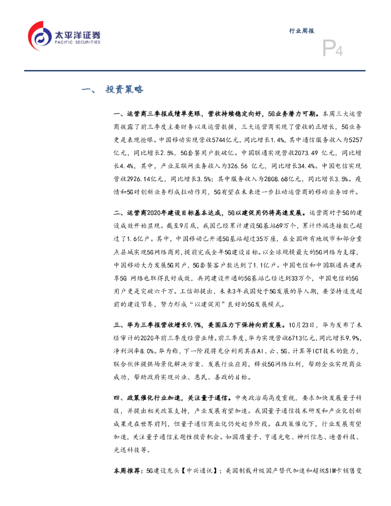 太平洋证券:通信行业周报:运营商三季报业绩亮眼,5G以建促用仍将高速发展.pdf
