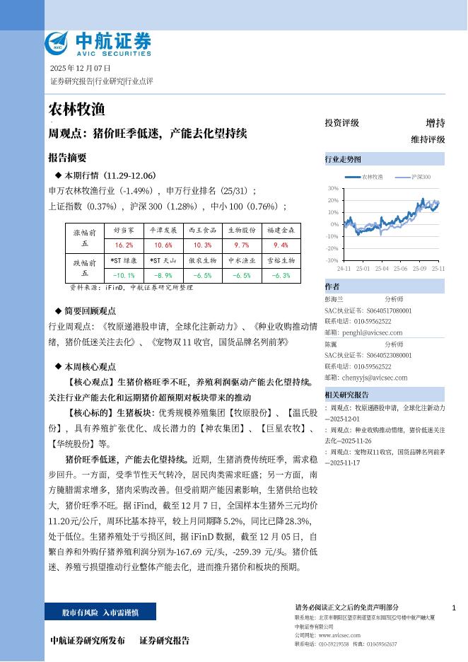 中航证券:农林牧渔周观点:猪价旺季低迷,产能去化望持续.pdf