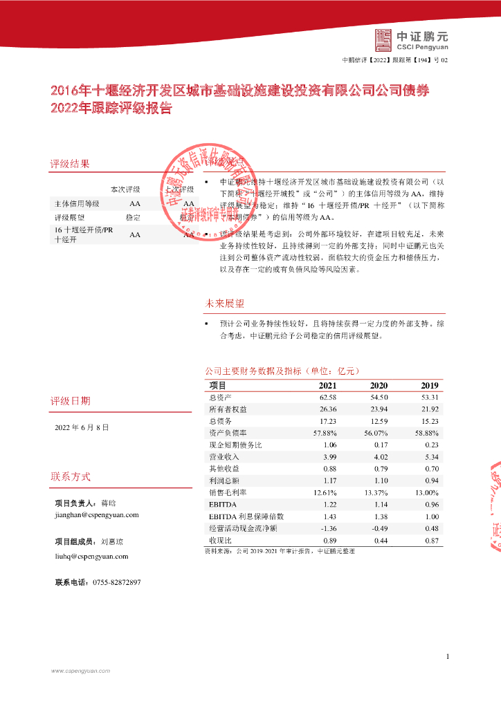 鹏元:2016年十堰经济开发区城市基础设施建设投资有限公司公司债券2022年跟踪评级报告.pdf