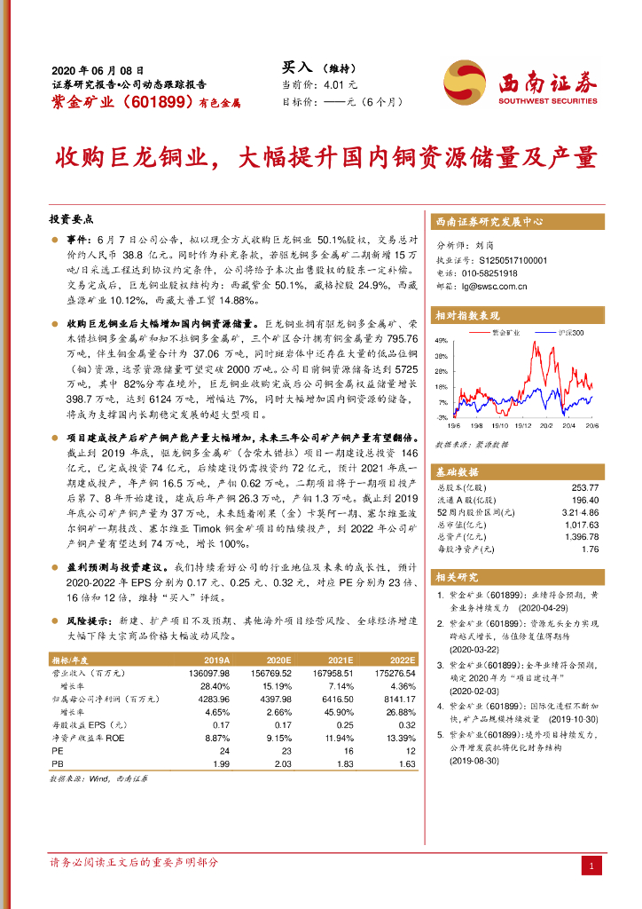 西南证券:紫金矿业(601899)-收购巨龙铜业,大幅提升国内铜资源储量及产量.pdf