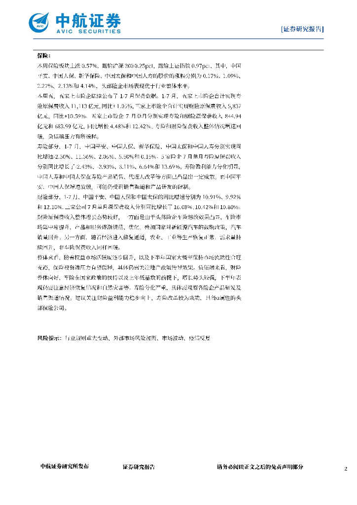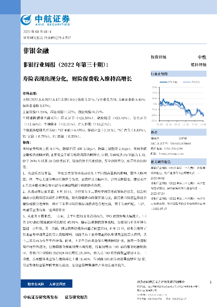 中航证券:非银行业周报(2022年第三十期):寿险表现出现分化,财险保费收入维持高增长.pdf