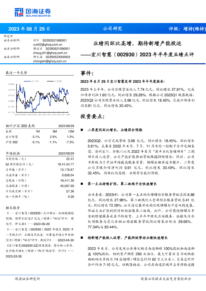 国海证券:宏川智慧(002930)-2023年半年度业绩点评:业绩同环比高增,期待新增产能投运.pdf