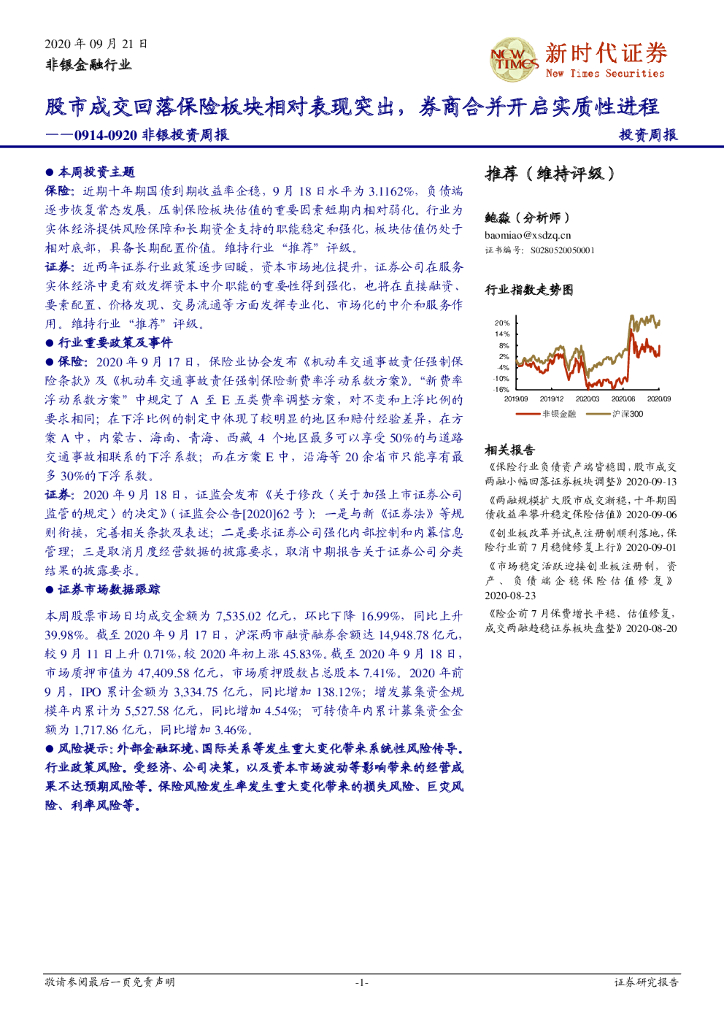 新时代证券:非银投资周报:股市成交回落保险板块相对表现突出,券商合并开启实质性进程.pdf