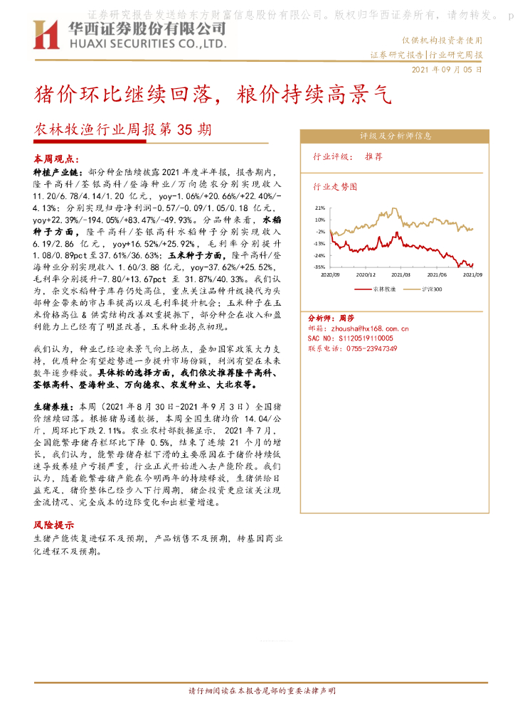 华西证券:农林牧渔行业周报第35期:猪价环比继续回落,粮价持续高景气.pdf