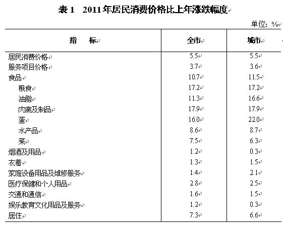 全市居民消费价格比上年上涨5.5%,涨幅提升2.4个百分点;商品零售价格上涨5.5%,涨幅提升2.0个百分点。城市居民消费价格上涨5.5%,涨幅提升2.6个百分点;城市商品零售价格上涨5.4%,涨幅提升1.6个百分点。原材料、燃料、动力购进价格上涨10.8%。工业品出厂价格上涨8.5%。固定资产投资价格上涨7.2%。