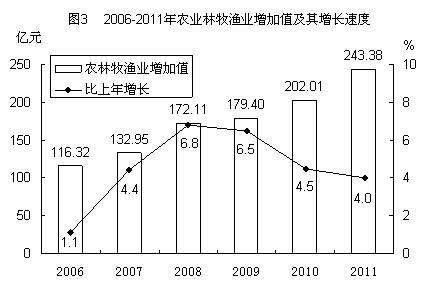 全年完成农林牧渔业增加值243.38亿元,比上年增长4.0%,其中农业增加值136.83亿元,增长7.5%;林业增加值11.28亿元,增长9.5%;牧业增加值81.40亿元,减少2.8%;渔业增加值9.12亿元,增长2.0%;农林牧渔服务业增加值4.75亿元,增长8.7%。