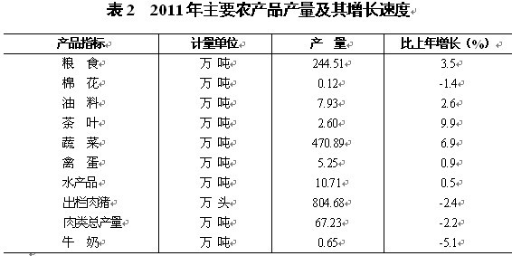 全年粮食种植面积36.6万公顷,比上年增长1.1%,其中稻谷播种面积33.7万公顷,增长0.6%,优质稻种植面积所占比重为80.0%;蔬菜种植面积14.7万公顷,增长5.3%;油料种植面积4.9万公顷,增长2.9%;出栏肉猪804.7万头,减少2.4%。主要农产品产量保持稳定。