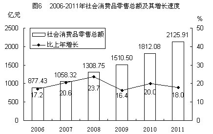 全年实现社会消费品零售总额2125.91亿元,比上年增长18.0%,增速回落2.0个百分点。按经营地统计,城镇消费品零售额2035.97亿元,增长18.1%;乡村消费品零售额89.94亿元,增长16.8%。按消费形态统计,商品零售额1892.78亿元,增长18.1%;餐饮收入额233.13亿元,增长17.6%。