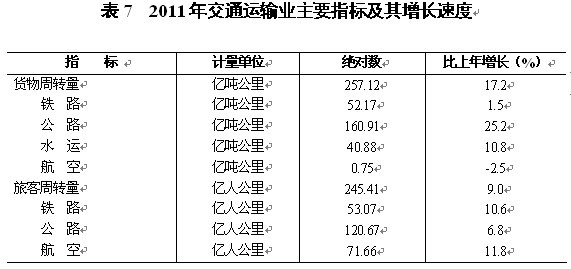 5、全社会运输周转量是铁路、公路、水路、航空、管道五种运输方式的客、货运周转量加权计算而来。2011年航空运输的客、货运周转量统计测算方法进行了调整,全社会运输周转量的增长速度按调整后的数据计算。