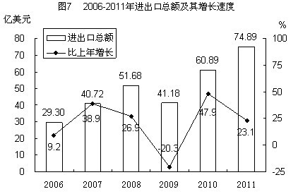 全年进出口总额(海关口径)74.89亿美元,比上年增长23.1%,其中出口总额40.84亿美元,增长15.0%;进口总额34.05亿美元,增长34.6%。在出口总额中,机电产品19.96亿美元、高新技术产品4.8亿美元,分别占出口总额的48.9%和11.7%;在进口总额中,机电产品24.5亿美元、高新技术产品5亿美元,分别占进口总额的71.9%和14.7%。