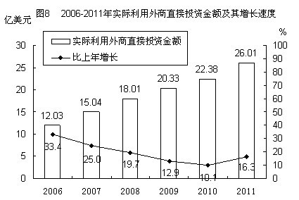 全年利用外资项目(企业)185个。实际使用外商直接投资26.01亿美元,比上年增长16.3%。全年新增实际到位省外境内资金项目365个,实际到位省外境内资金达390.73亿元,增长20.1%。