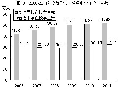 全市拥有普通高校50所,普通高中72所,初中学校208所,普通小学987所。在学研究生4.90万人,增长5.8%;普通高校在校学生51.68万人,比上年增长1.7%;普通高中在校学生11.76万人,增长5.5%;普通初中在校学生20.75万人,增长5.9%;普通小学在校学生42.54万人,增长2.9%;幼儿园在园幼儿19.34万人,增长12.7%。小学适龄儿童入学率100%,小学升初中入学率106.8%。全市共投入义务教育“免补”经费4.78亿元,114.2万人次学生享受了“一费制”全免入学。免除了122.3万学生杂费,义务教育阶段学生杂费免除率达100%。补助了4.66万人次农村贫困寄宿学生生活费。