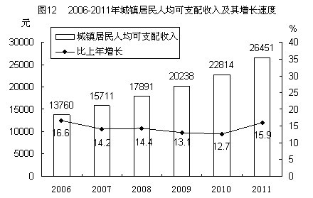 全年城镇居民人均可支配收入26451元,比上年增加3637元,比上年增长15.9%。其中,人均工资性收入15069元,增长7.1%;人均经营净收入4195元,增长20.6%。城镇居民人均消费性支出17782元,增加1686元,增长10.5%,服务性消费支出4991元,增长5.0%。城镇居民恩格尔系数为35.9%。在城镇居民消费分类中,食品消费增长18.0%;衣着消费增长28.8%;家庭设备用品及服务消费下降7.4%;医疗保健消费下降4.8%;交通和通信消费增长7.0%;居住消费下降2.4%;教育文化娱乐服务消费增长10.9%;其他商品和服务消费增长8.5%。城市居民年末每百户家庭拥有家用汽车29.7辆,家用电脑88.1台,接入互联网的计算机68.4台。人均住房建筑面积33.1平方米,比上年增加1.51平方米。