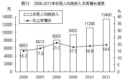 全年农村居民人均可支配收入12717元,比上年增加2077元,增长19.5%;农民人均纯收入13400元,增长19.6%,其中工资性收入6784元,增长26.7%。全年农民人均生活消费支出8579元,增长13.9%,在消费分类中增长最快的是衣着消费支出和家庭设备用品消费支出,分别增长22.7%和20.8%。农村居民恩格尔系数为37.8%。平均每百户家庭拥有家用汽车21.9辆,家用电脑38.7台,移动电话机212.9台,分别增加7.6辆、15.3台和30台。农村居民人均住房面积62.04平方米,增加2.51平方米。
