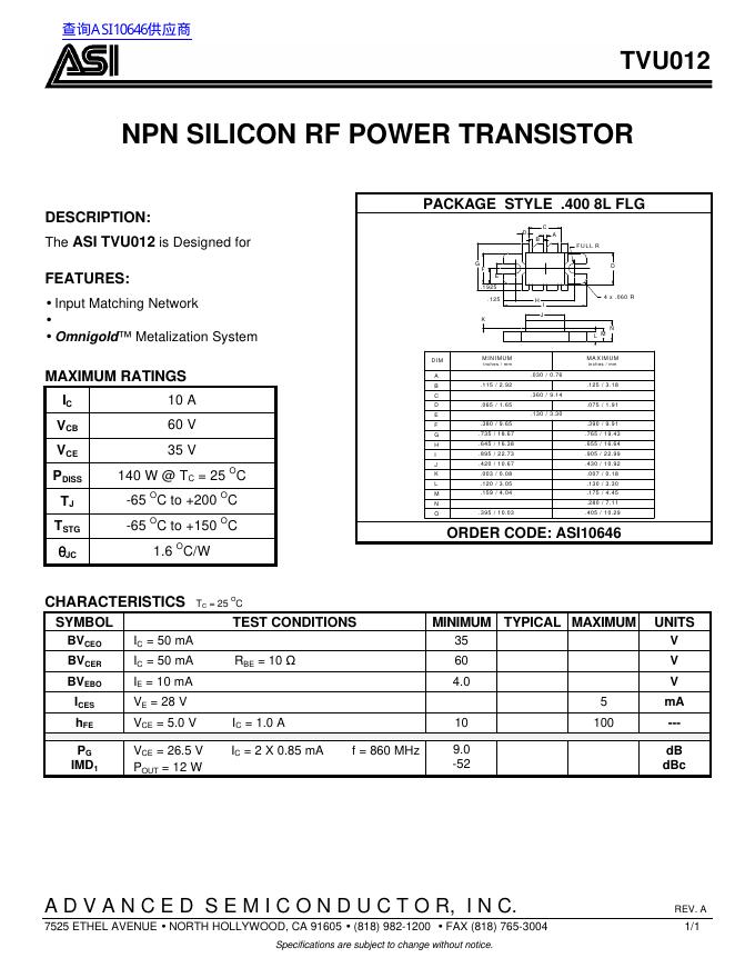 NPN SILICON RF POWER TRANSISTOR TVU012 数据手册.pdf