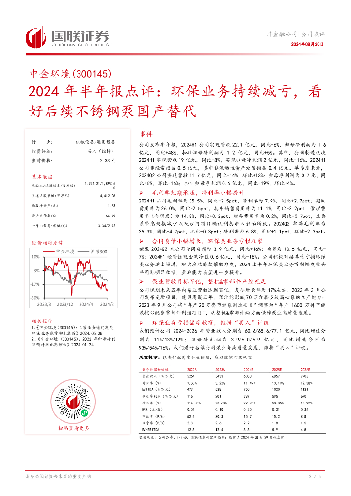 国联证券:中金环境(300145)-2024年半年报点评:环保业务持续减亏,看好后续不锈钢泵国产替代.pdf