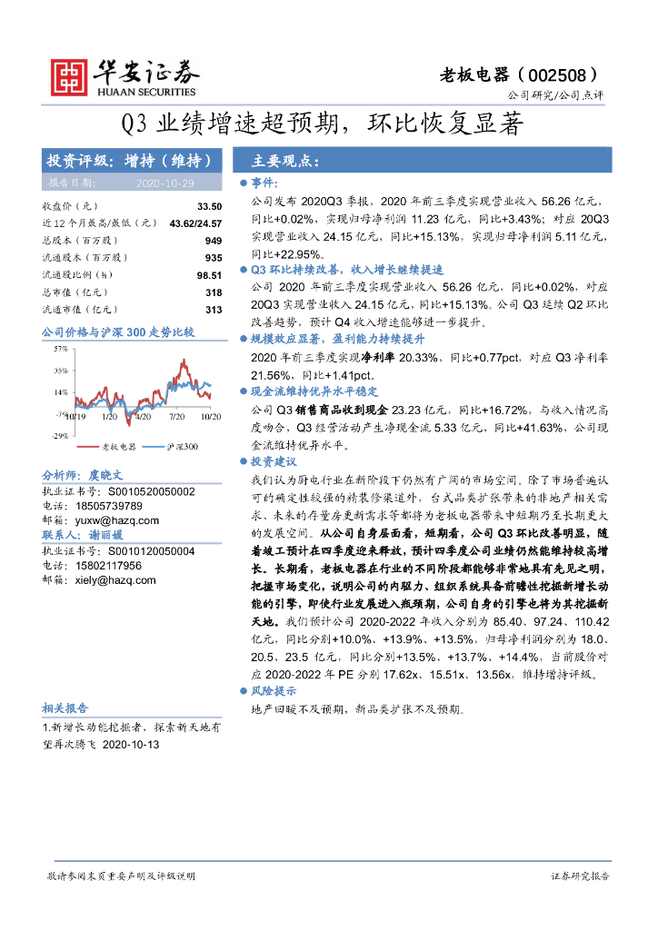 华安证券:老板电器(002508)-Q3业绩增速超预期,环比恢复显著.pdf