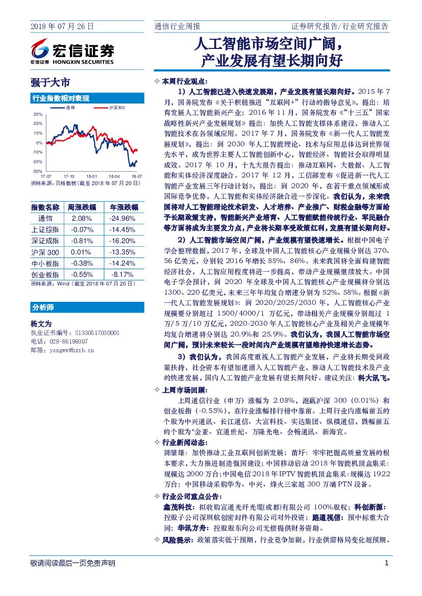 宏信证券:通信行业周报:人工智能市场空间广阔,产业发展有望长期向好.pdf